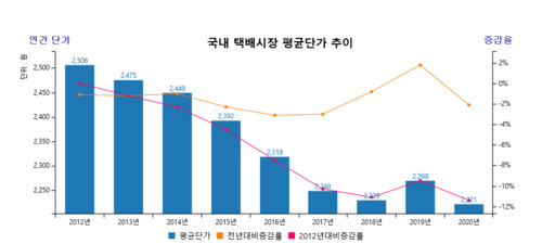 신종 코로나바이러스 감염증(코로나19) 팬데믹으로 택배가 폭발적으로 늘어난 지난해에도 택배 평균단가는 1년전의 2269원보다 2.1% 떨어졌다.