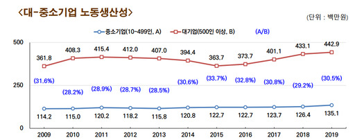 특히 중소기업 근로자의 2019년 평균 월급은 10년 전인 2009년 당시 대기업 근로자의 월급에도 미치지 못하고 있는 것으로 파악됐다.