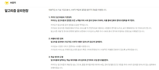 카카오는 2018년 알고리즘 윤리헌장 발표에 이어 2020년 카카오 알고리즘 윤리헌장을 개정했으며, 지난 1월 '카카오 인권경영선언문'을 제정하고 이를 구체화하기 위해 '증오발언 근전을 위한 원칙'을 발표하는 등 후속 작업에 나서고 있다. 특히, 사내에서 AI 개발 및 운영시 AI 윤리헌장을 제대로 적용할 수 있도록 직원 교육에 앞장서고 있다.