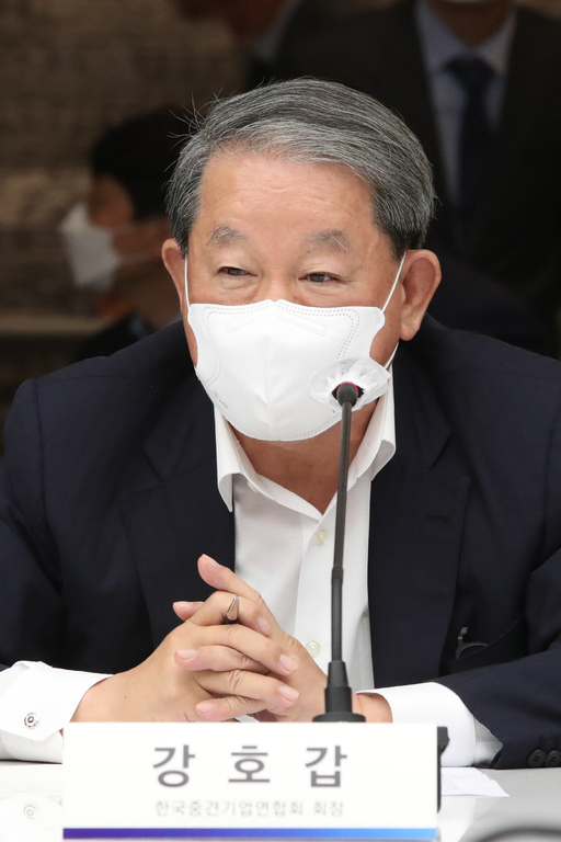 강호갑 중견련 회장이 3일 서울 중구 대한상공회의소에서 '국무총리-경제단체장 간담회'에 참석해 인사말을 하고 있다. / 손진영기자 son@