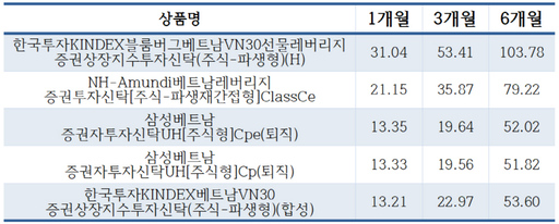 상품별로 살펴보면 한국투자KINDEX블룸버그베트남VN30선물레버리지증권상장지수투자신탁(주식-파생형)(H)의 최근 한 달 수익률이 31.04%로 가장 높았다. NH-Amundi베트남레버리지증권투자신탁[주식-파생재간접형]ClassCe가 21.15%로 뒤를 이었으며, 레버리지형을 제외할 경우 삼성베트남증권자투자신탁UH[주식형]Cpe(퇴직)이 13.21%로 가장 높은 수익률을 기록했다.