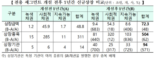전용 세그먼트 개설 전후 1년을 비교하면 개설후에 SRI채권 상장금액, 상장종목, 상장기관 모두 뚜렷하게 증가했다. 개설 이후 신규상장 금액은 개설 전보다 48% 증가한 72조3000억원, 상장종목은 62% 증가한 504개, 상장기관은 571% 증가한 94개를 기록했다.