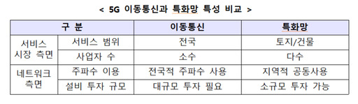 5G 이동통신은 소수의 사업자가 대규모 투자를 통해 전국 단위 대규모 네트워크를 구축하고 서비스를 제공하는 반면, 5G 특화망은 다수 사업자가 토지·건물 등 제한된 구역에서 소규모 네트워크를 구축하고 소규모 투자로도 서비스 제공이 가능하다는 차이가 있다.