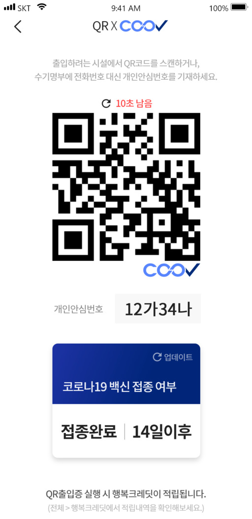 지난해부터 통신 3사는 질병관리청 간 협업을 통해 패스 앱에서 QR코드를 통한 전자출입명부 서비스를 제공해왔다. 앞으로는 전자예방접종증명(COOV, 쿠브) 앱과도 연계해 패스 앱의 QR 출입증 화면에서 이용자의 코로나 19 백신 접종 정보를 추가로 제공한다.
