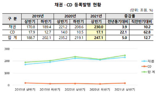 올 상반기 기업 등이 채권·양도성예금증서(CD) 전자등록시스템을 통해 약 247조1000억원을 조달한 것으로 나타났다. 전년 동기(235조2000억원) 대비 5%, 직전 반기(219조1000억원) 대비 12.7% 증가한 수치다.