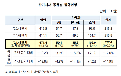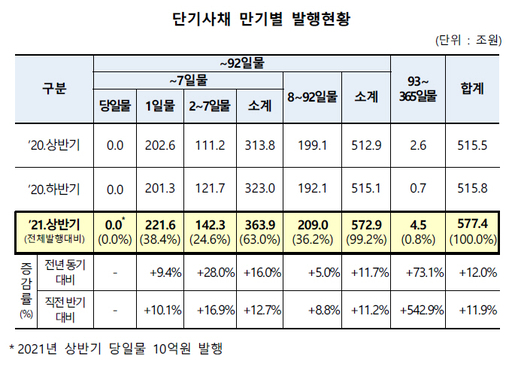 종류별로 보면 일반 단기사채의 발행량은 471조4000억원으로 전년 동기(416조5000억원) 대비 13.2%(54조9000억원) 증가했고, 유동화 단기사채(특수목적회사 발행) 발행량은 106조원으로 전 년동기(99조원) 대비 7.1%(7조원) 증가했다. 전량 달러(USD)로 발행되는 외화표시 단기사채는 14억400만달러 발행돼 전년 동기(7억9260만달러) 대비 77.1% 증가했고, 직 전반기(8억2410만달러) 대비 70.4% 증가했다. 만기별로는 3개월 이내 발행량이 572조9000조원으로 전체의 99.2%를 차지했다. 대부분 만기 3개월 이내로 발행되는 추세가 지속됐는데, 이는 증권신고서 제출 면제 혜택을 받을 수 있기 때문인 것으로 보인다.