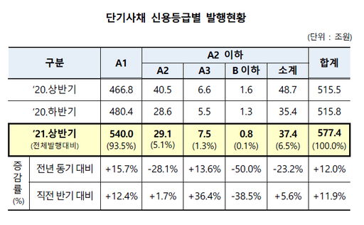 7일 이내 초단기물 발행량은 363조9000억원(전체의 63.0%)으로 전년 동기(313조8000억원) 대비 16.0% 증가했고, 직전 반기(323조원) 대비 12.7% 증가했다. 이 중 1일물 발행량이 221조6000억원으로 전체 발행량의 38.4%를 차지했다. 93∼365일 이내 만기물의 발행량은 4조5000억원(전체의 0.8%)으로 전년 동기(2조6000억원) 대비 73.1% 증가했고, 직전 반기(7000억원) 대비 542.9% 증가했다. 신용등급별로는 A1(540조원), A2(29조1000억원), A3(7조5000억원), B이하(8000억원) 순으로 발행량이 많았다. A1등급의 발행량은 전년 동기(466조8000억원) 대비 15.7% 증가했고, 직전 반기(480조4000억원) 대비 12.4% 증가했다. A1등급의 발행이 전체 발행량의 대부분을 차지(93.5%)해 안전자산 투자 선호에는 큰 변화가 없는 것으로 나타났다.