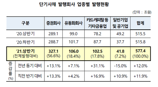 16일 한국예탁결제원에 따르면 올 상반기 기업이 단기사채(STB, Short-Term Bond)를 발행해 조달한 자금은 총 577조4000억원인 것으로 집계됐다. 전년 동기(515조5000억원)에 비해선 12%(61조9000억원), 직전 반기(515조8000억원)에 비해선 11.9%(61조6000억원) 증가한 수치다.