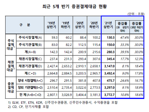 올 상반기 증권결제대금이 총 3772조7000억원(일평균 30조6700억원)으로 역대 최대 규모 기록했다. 전년 동기(3404조4000억원) 대비 10.8%, 직전 반기(3181조3000억원) 대비 18.6% 증가한 수치다.