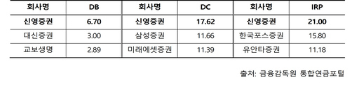 20일 금융감독원 통합연금포털에 따르면 지난 6월 말 기준 신영증권의 IRP와 DC형 1년 수익률은 각각 21%, 17.62%다. IRP 수익률이 20%를 넘긴 사업자는 신영증권이 유일하다. DB형 수익률도 6.7%를 기록해 가장 높았다. 지난달 말을 기준으로 한 과거 수익률이 미래 수익을 보장하는 것은 아니며, 퇴직연금상품은 실적배당형 상품으로 운용 결과에 따라 투자원금의 손실이 발생할 수 있다는 점은 유의할 필요가 있다.