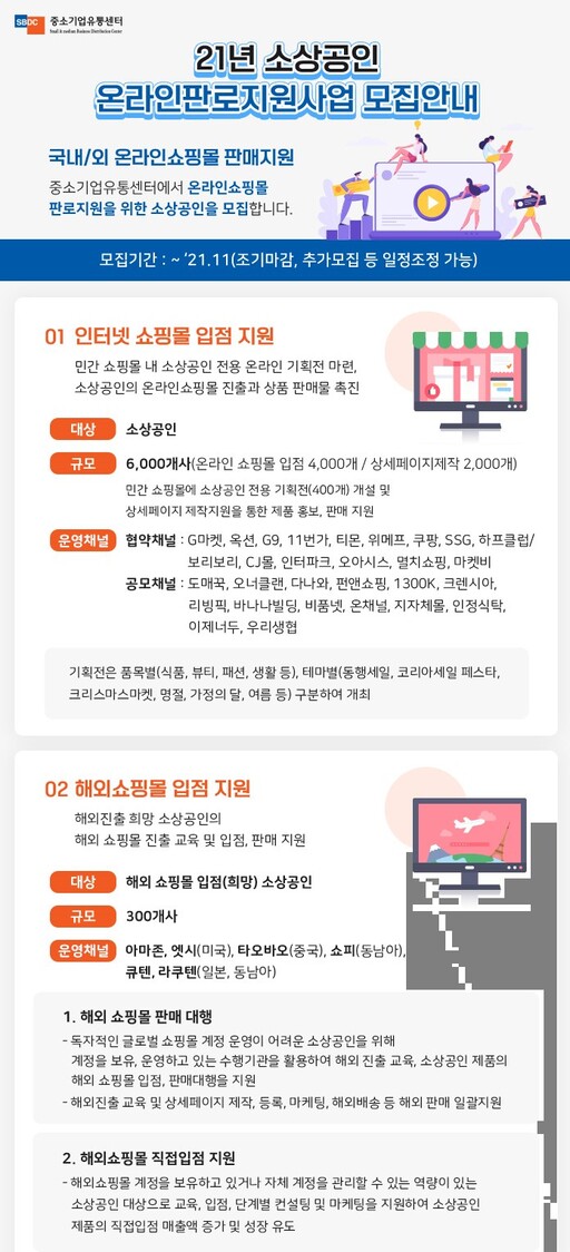 중소기업유통센터가 소상공인 온라인쇼핑몰 입점 지원, 상세페이지 제작지원, 해외쇼핑몰 입점지원을 원하는 소상공인을 추가로 모집한다.
