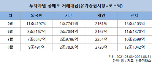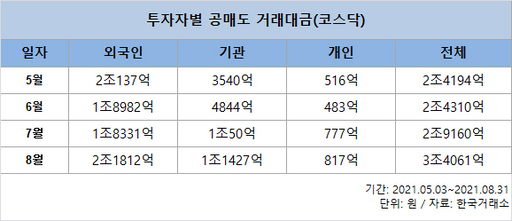 시장별로 보면 유가증권시장의 공매도 거래는 외국인 투자자의 영향을 직접적으로 받았지만 코스닥시장의 경우엔 기관이 외국인의 빈자리를 메우면서 공매도 거래대금이 4개월 내내 상승하는 모습을 보였다. 기관투자자의 코스닥시장 공매도 거래대금은 5월 3540억원에서 8월 1조1427억원으로 223% 상승했다.