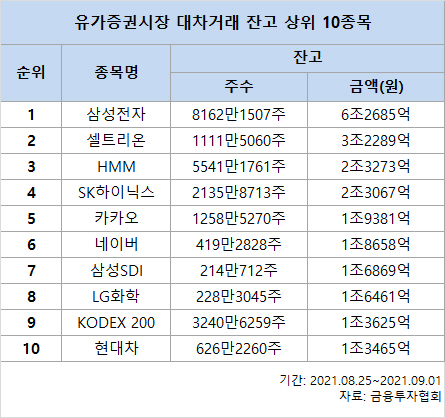 유가증권시장에선 삼성전자와 SK하이닉스, 삼성SDI 등 반도체 관련 종목이 대차거래 잔고 상위권에 이름을 올렸다. 코스닥시장 10종목에선 최근 신작 부진을 겪고 있는 게임주인 카카오게임즈, 펄어비스가 눈에 띈다. 개인 투자자들의 K스톱 운동 표적이었던 셀트리온과 에이치엘비는 여전히 각 시장 내 대차거래 잔고 상위권에 머무르는 중이다.