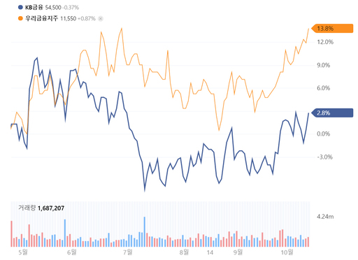한국거래소에 따르면 이달 들어(10월 1일~10월 15일) 외국인 투자자가 가장 많이 사들인 종목 4위가 KB금융(순매수액 710억8771만원)이었다. 우리금융지주가 12위(순매수액 311억4759만원)로 뒤를 이었다.