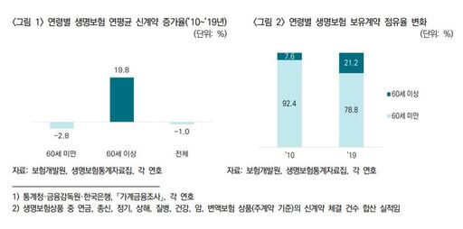26일 보험연구원에 따르면 고령층의 신규 보험가입 확대와 보유계약 중 고령층 계약 비중이 늘고 있다. 가입연령 및 보장범위 확대로 최근 10년간 60세 이상 생명보험 신 계약 체결 건수는 연평균 19.8% 증가했다. 같은 기간 건강보장에 대한 관심 증가로 질병보험 판매가 32.4% 늘며 가장 큰 증가율을 기록했고, 종신보험 판매량도 13.4% 확대됐다.