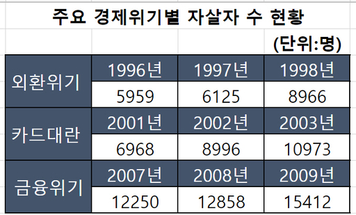 1997년 국제통화기금(IMF) 외환위기 당시, 극단적 선택으로 세상을 떠난 사람은 6125명으로 전년(5959명) 대비 2.7% 증가한 뒤 이듬해 1998년에는 8699명으로 급증했다. 1997년~1998년 유례없는 불황을 겪으면서 자살자가 45.9% 증가한 셈이다. 이들 중 66.2%는 가정의 허리 역할을 담당하는 35~59세 중·장년층이었다.