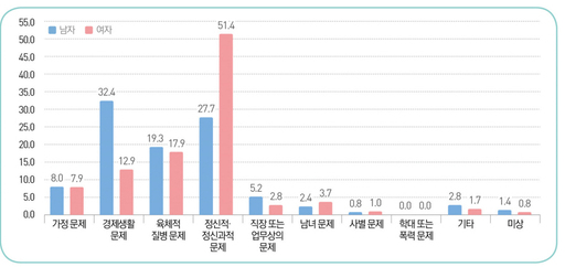 질병관리청에 따르면 소득수준이 낮은 성인의 자살생각률은 청년기 6.5%, 장년기 4.2%, 중년기 10.4%, 노년기 12.7%로 노년기가 소득수준이 '하'인 경우 자살생각률이 가장 높았다. 또 일할 능력은 있으나 일하지 못하는 실업자와 비경제활동인구에서 자살생각률이 취업자(3.2%)보다 높았다. 개인의 경제활동이나 소득수준에 따라 자살률이 증가할 수 있다는 분석이다.