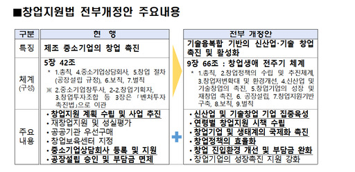 또 총 9장, 66조로 이뤄진 법은 창업생태계의 성장 구조를 반영해 창업저변 확대→신산업·기술 창업 촉진→글로벌 성장 및 재창업 순으로 조문 체계를 재구성했다.