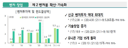 이런 가운데 정부는 지난 20일 발표한 2022년 경제정책방향에서도 각종 제도 개선과 정책 지원 확대 등의 내용을 포함해 내년에도 '제2벤처붐'을 더욱 확산시켜나간다는 계획이다.