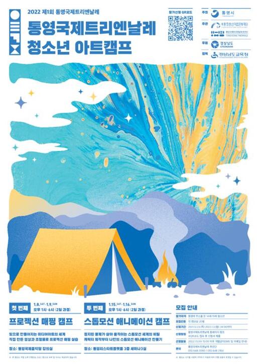 참가대상은 통영에 주소를 둔 청소년 40명(프로젝션 매핑 캠프 20명, 스톱모션 애니메이션 캠핑 20명)이며, 참가 지원은 23일부터 2022년 1월 3일까지 온라인 신청을 통해 가능하다. 자세한 사항은 통영국제트리엔날레 홈페이지에서 확인할 수 있다.