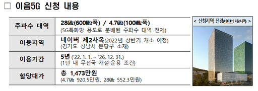 과학기술정보통신부는 네이버클라우드(주)가 신청한 5세대 이동통신(5G) 특화망 주파수 할당과 기간통신사업 등록이 28일 완료됐다고 밝혔다.