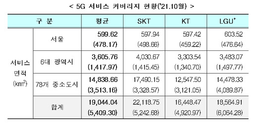 5G 무선인터넷 서비스 커버리지는 옥외의 경우, 10월 기준 통신사가 공개한 85개시 5G 커버리지 지역 면적은 3사 평균 1만 9044.04㎢로, 2020년 하반기 대비 3.5배로 확대됐다. 또 5G 서비스 품질평가 결과, 5G 다운로드 전송속도는 3사 평균 801.48Mbps로, 전년(690.47Mbps) 대비 16.1% 향상된 것으로 나타났다.