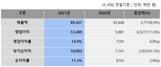 회사 측 공시에 따르면 전년 대비 매출액은 6.9% 증가한 894억원을 기록했고, 영업이익은 111.0% 대폭 성장한 124억원으로 2배 이상 오른 것으로 집계됐다. 모두 창사 이래 최대 실적이다. 또한 같은 기간 당기순이익은 41.3% 상승해 101억원으로 나타났다.
