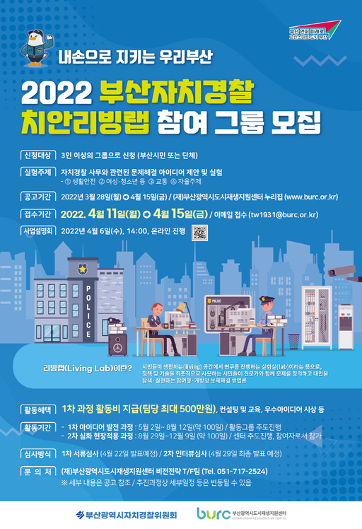 부산광역시도시재생지원센터는 시민 중심의 맞춤형 치안모델 개발을 위한 2022년 '부산자치경찰 치안리빙랩 프로젝트'의 참여 워킹그룹을 모집한다.