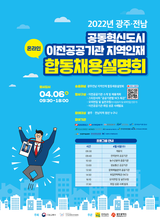 채용설명회는 국토교통부와 국가균형발전위원회가 주최하며, 전남도와 광주시가 공동 주관한다. 코로나19 확산 방지를 위해 비대면 방식으로 진행하며, 유튜브 채널 '광주전남 지역인재 합동채용설명회'를 통해 참여할 수 있다.
