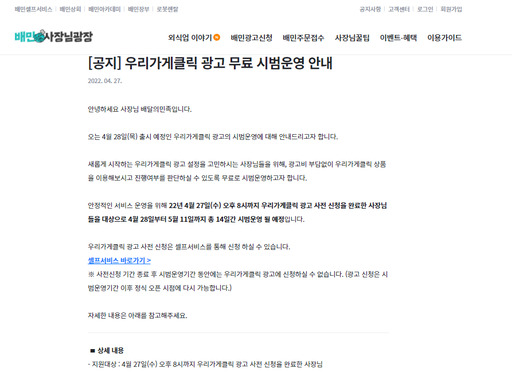 배민이 우리가게클릭 서비스를 실시한다고 발표하면서 자영업자들의 불만이 거세지자 배민 운영사인 우아한형제들은 28일 우선 광고를 무료로 시작했다. 오는 5월 11일까지 총 14일간 시범 운영을 실시한 후 이후 유료로 전환한다는 계획이다.