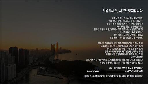 부산관광공사(이하 공사)는 부산광역시(이하 부산시)와 함께 추진하는 부산 대표 도시브랜드 개발 사업 '세븐브릿지 랜드마크 프로젝트(이하 세븐브릿지 프로젝트)'의 첫 번째 콘텐츠인 스토리텔링 개발을 완성, 공개할 계획이라고 17일 밝혔다.