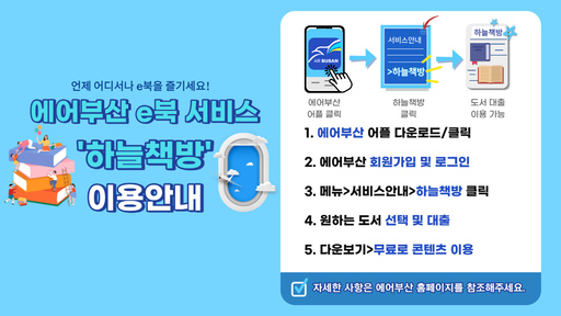 하늘책방 이용방법은 에어부산 앱에 로그인해 '서비스 안내' 카테고리 내 '하늘책방'을 클릭하면 된다.