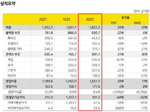 2022년 2분기 영업비용은 전 분기 대비 11%, 전년 동기 대비 39% 늘어난 1조 6513억원으로 글로벌 콘텐츠 사업 확대 등으로 인한 마케팅 투자 등이 영향을 미쳤다.