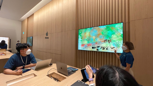 실제로 픽업존 앞 세션 테이블에서 직접 체험해 본 '아트 산책' 세션은 애플 스페셜리스트의 가이드로 진행됐다. 아이패드와 애플펜슬을 사용해 프로크리에이터(procreate) 어플리케이션을 실행, 자신만의 작품을 그려볼 수 있었다. 애플의 다양한 세션들은 애플 홈페이지를 통해 예약 신청 후 참여할 수 있다. 통상 1일 90분간 7명 정원으로 야외에서 진행된다.