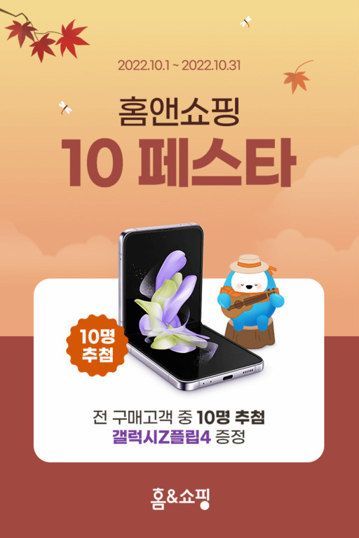 3일 홈앤쇼핑에 따르면 우선 10월 한 달간 전 구매 고객 중 10명을 추첨해 '갤럭시 Z플립4'를 증정하는 '홈앤쇼핑 10 페스타' 경품 이벤트를 진행한다. 10월 한 달간 홈앤쇼핑에서 제품을 구매하는 고객은 누구나 경품 이벤트에 자동 응모된다.