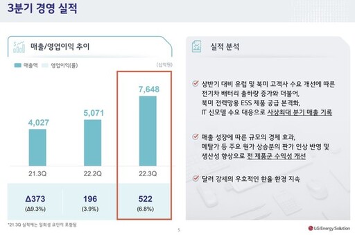 이창실 LG에너지솔루션 최고재무책임자(CFO) 전무는 "북미 및 유럽 고객향 전기차 배터리 출하량이 증가했고, 북미 전력망용 에너지저장장치(ESS) 제품 공급 본격화, 정보기술(IT) 신모델 수요 대응 등으로 사상 최대 분기 매출을 기록했다"고 말했다. 또 "올해 3분기는 매출 성장에 따른 규모의 경제 효과, 메탈 등 주요 원재료 원가 상승분의 판가 인상 반영 및 생산성 향상 등으로 전 제품군의 수익성이 개선됐다"며 "이 밖에도 달러 강세의 우호적인 환율 환경이 지속됐다"고 덧붙였다.