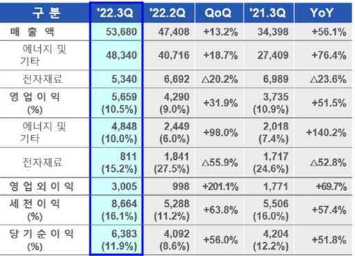 LG에너지솔루션은 3분기 매출 7조6482억원, 영업이익 5219억원을 기록했다. 매출액은 전년 동기(4조274억원) 대비 89.9%, 전분기(5조706억원) 대비 50.8% 증가하며 분기 기준 최대치를 기록했다.