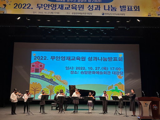 무안교육지원청(교육장 김선치)은 2022. 10. 27.(목) 무안영재교육원에 재학하는 학생들과 학부모와 함께 무안군 승달문화예술회관에서 2022. 무안영재교육원 성과나눔 발표회를 개최하였다.