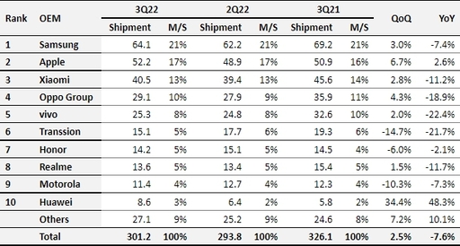 시장조사업체 옴디아에 따르면 삼성전자는 갤럭시S 시리즈와 갤럭시Z 시리즈 판매 성적이 삼성전자 MX부분 실적을 견인했다. 삼성전자는 3분기 글로벌 스마트폰 시장 점유율 1위를 유지했고 '프리미이엄폰'으로 분류되는 아이폰14 시리즈를 출시한 애플이 글로벌 스마트폰 시장 점유율 2위를 기록했다.