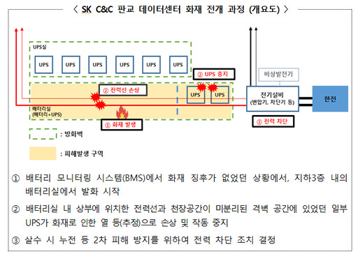 정부 조사 결과, SK C&C 판교 데이터센터가 배터리 온도 등을 모니터링하는 시스템(BMS)를 갖추고 있는데, 당초 발화로 인해 온도가 올라가면 BMS 센서가 달라진 온도를 인지하고 징후를 보여야만 한다. 하지만 이 BMS가 화재 발생 직전까지 아무 이상징후를 보이지 않았고 지하 3층 내 배터리실에서 발화가 시작됐다.