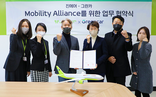 진에어가 16일 마곡 사무실에서 다양한 모빌리티 서비스 제공을 위해 카셰어링 업체인 그린카와 전략적 파트너십 MOU를 체결했다.