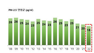 서울시가 2022년 초미세먼지(PM-2.5) 연평균 농도는 18㎍/㎥로 2020년부터 3년 연속 최저 농도를 경신했다고 3일 밝혔다. 지난해 서울시 초미세먼지 연평균 농도는 2008년 26㎍/㎥ 대비 약 31% 감소했으며, 2021년의 20㎍/㎥과 비교해서도 2㎍/㎥ 줄어든 수치다.