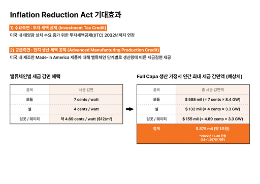 한화솔루션 측은 당장 7000억원 이상의 세액공제를 받을 수 있을 것으로 예측하며, 풀 케파 생산을 가정할 경우 최대 세액공제액이 1조원에 달할 것으로 추정했다.