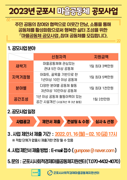 신청기간은 2월 10일 17시까지이며 이메일로 지원 신청 할 수 있으며, 자세한 내용은 군포시 자치분권과 및 군포시 사회적경제?마을공동체지원센터로 문의하면 된다.