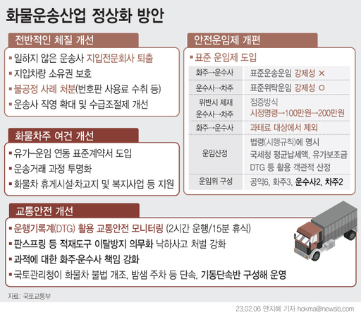정부는 이와 함께 화물차 실소유자 명의로 지입계약을 하도록 했다. 지입 계약 시 운송사 명의로 화물차를 등록하는 현행 방안은 없어지는 것이다. 이를 위반 시 화물차 번호판을 회수하는 감차 처분이 이뤄진다.