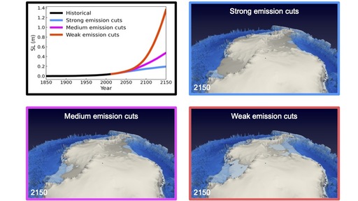 이에 IBS 연구진은 빙상, 빙산, 빙붕, 해양 그리고 대기 요소를 모두 결합한 새로운 기후 모델을 개발하고, 기후 변화에 관한 정부 간 협의체(IPCC) 6차 보고서에서 제시한 3가지 이산화탄소 배출 시나리오 따른 남극 빙상 및 해수면 변화를 모의했다.