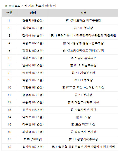 지원자는 권은희(前 KT네트웍스 비즈부문장), 김기열(前 KTF 부사장), 김성태(現 대통령직속 디지털플랫폼정부위원회 자문위원), 김종훈(前 외교통상부 통상교섭본부장), 김진홍(前 KT스카이라이프 경영본부장), 김창훈(現 한양대 겸임교수), 남규택(前 KT 마케팅부문장), 박윤영(前 KT 기업부문장), 박종진(現 IHQ 부회장), 박헌용(前 KT그룹 희망나눔재단 이사장), 송정희(前 KT 부사장), 윤종록(前 미래창조과학부 차관), 윤진식(前 산업자원부 장관), 임헌문(前 KT 사장), 최두환(前 포스코ICT 사장), 최방섭(前 삼성전자 부사장), 한훈(前 KT 경영기획부문장), 홍성란(現 산업은행 윤리준법부 자금세탁방지 전문위원) 등 총 18인이다. (가나다순)