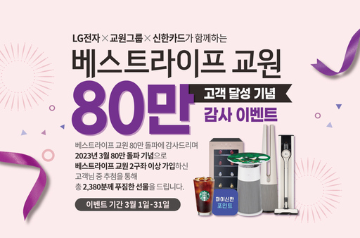 기간 중 LG전자 베스트샵에서 가전을 구입하며 '베스트라이프 교원'을 2구좌 이상 가입한 고객이 대상이다.
