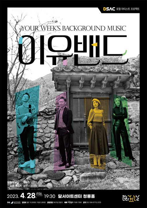 (재)달서문화재단 달서아트센터(관장 이성욱)는 'DSAC 로컬 아티스트 프로젝트' 네 번째 무대로 '2023 예술단체 공연 공모'에 선정된 '이유밴드'의 단독공연 「이유밴드 콘서트 : Your week's background music」를 4월 28일(금) 저녁 7시 30분에 달서아트센터 청룡 홀에서 개최한다.