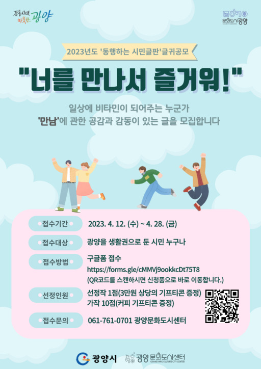 이번 시민 글귀 공모는 '만남'에 관한 공감과 감동을 주제로 하며, 광양시를 생활권으로 둔 시민이라면 누구나 참여할 수 있다.